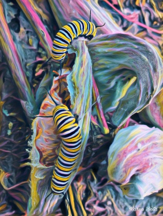 Last August I pulled a couple of stray milkweed plants growing in a crack between cement blocks that form the patio, and threw them on a pile of brush to compost. A few days later I noticed these two Monarch caterpillars munching away on the cracked-open pods.