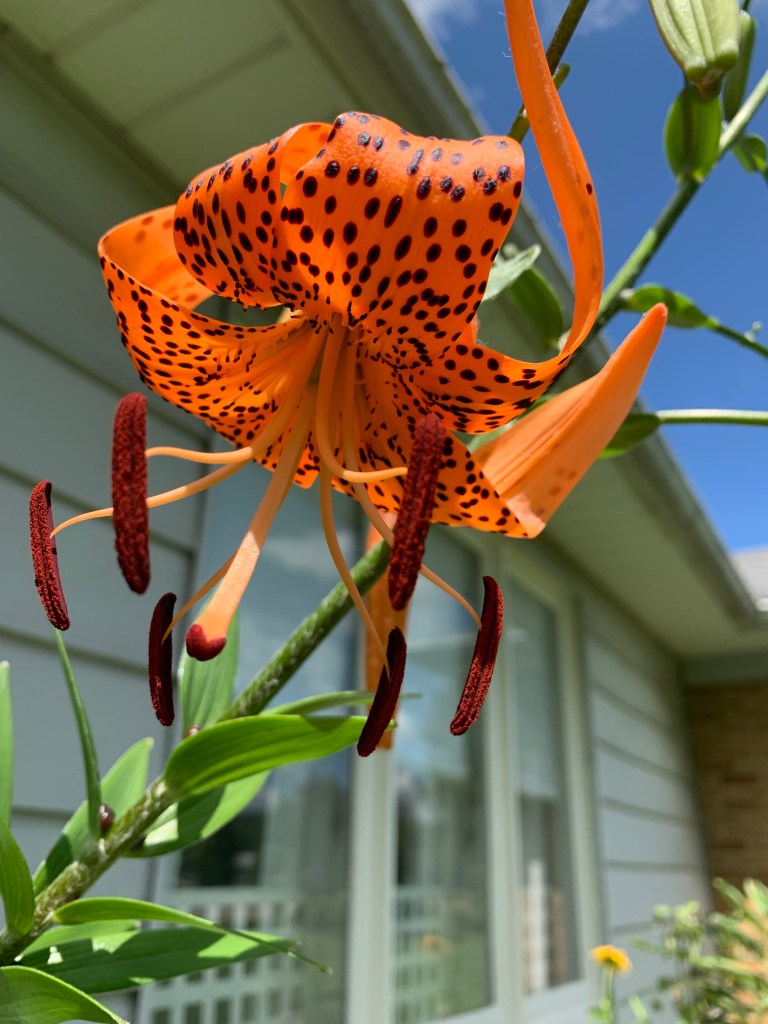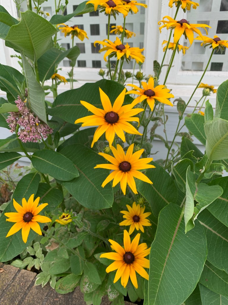 The hollyhocks continue to open, and the colors are striking in early morning when the sunlight hits them straight on from the horizon. No blooms yet from the Turk’s cap lilies. Soon. I can see the cheerful black-eyed susans out the kitchen windows.